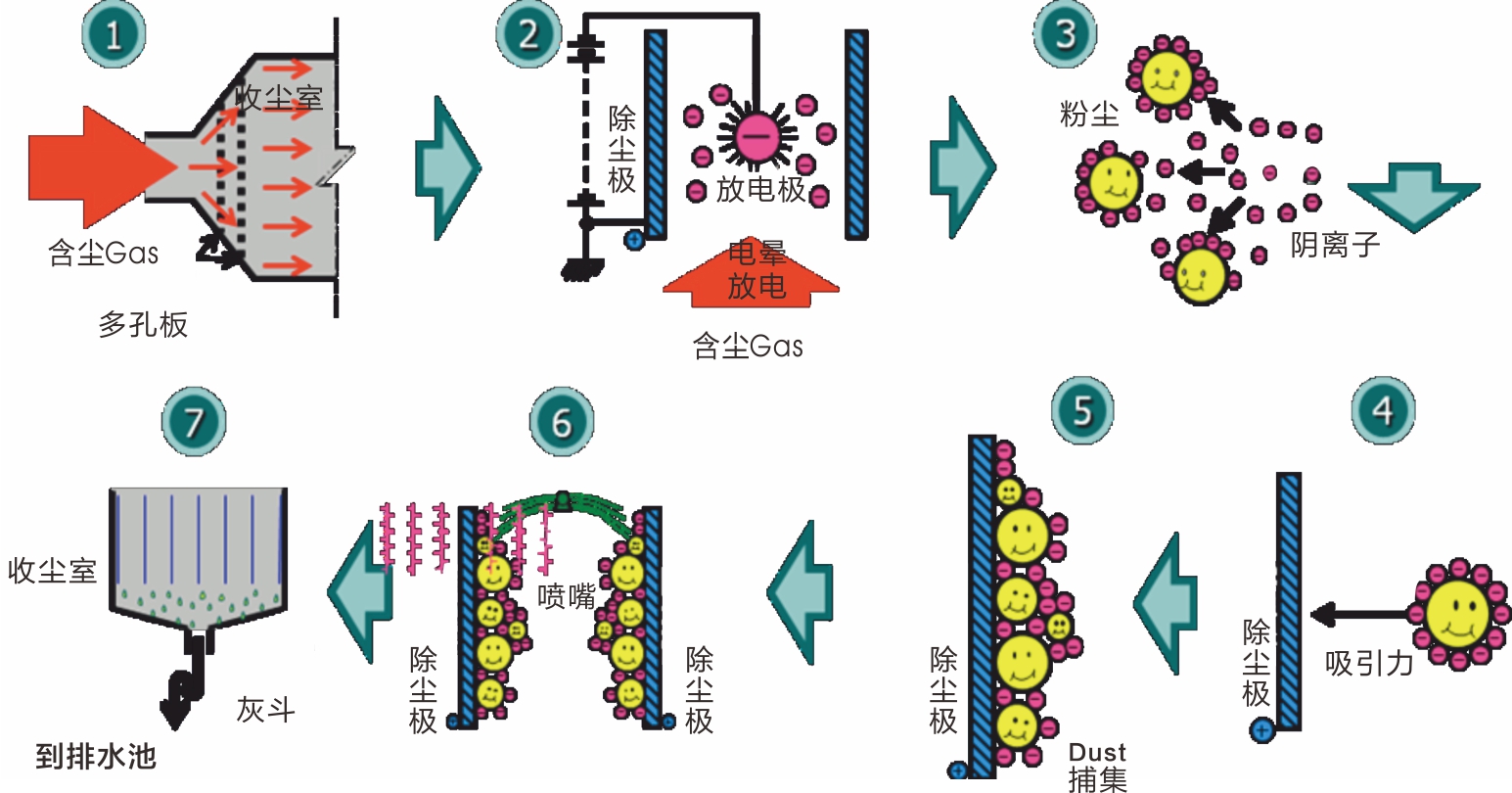 主要由殼體、進(jìn)口煙箱、陰極系統(tǒng)、陽極板/管、水沖洗系統(tǒng)(循環(huán)水系統(tǒng))、高壓電源、出口煙箱、氣流分布板、電控系統(tǒng)等組成。